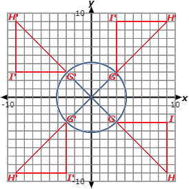In the image below, triangle GHI is located in quadrant 4. Quadrant 1 shows triangle GHI rotated 90° counterclockwise about the origin. Quadrant 2 shows triangle GHI rotated 180° counterclockwise about the origin. Quadrant 3 shows triangle GHI rotated 270° counterclockwise about the origin.